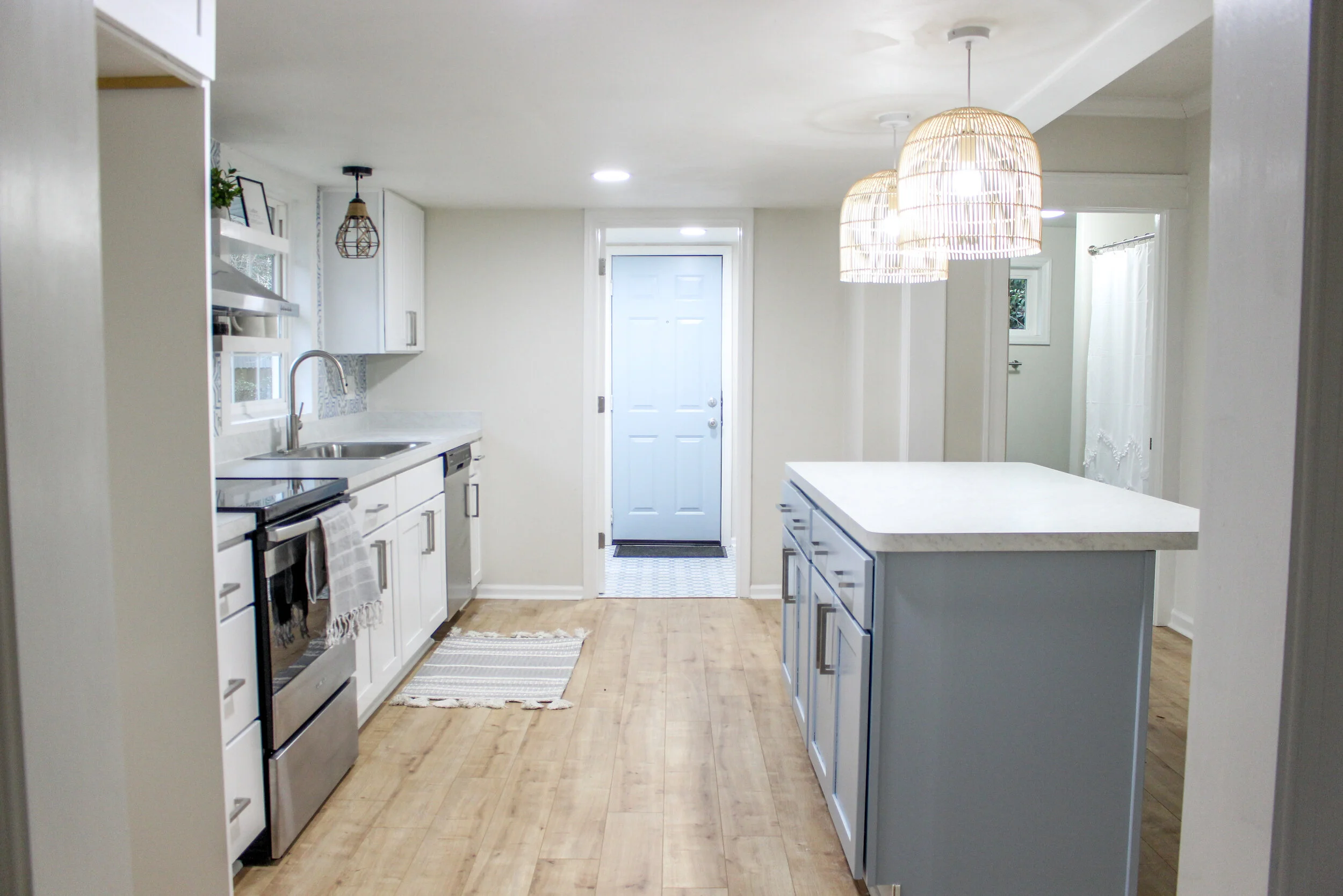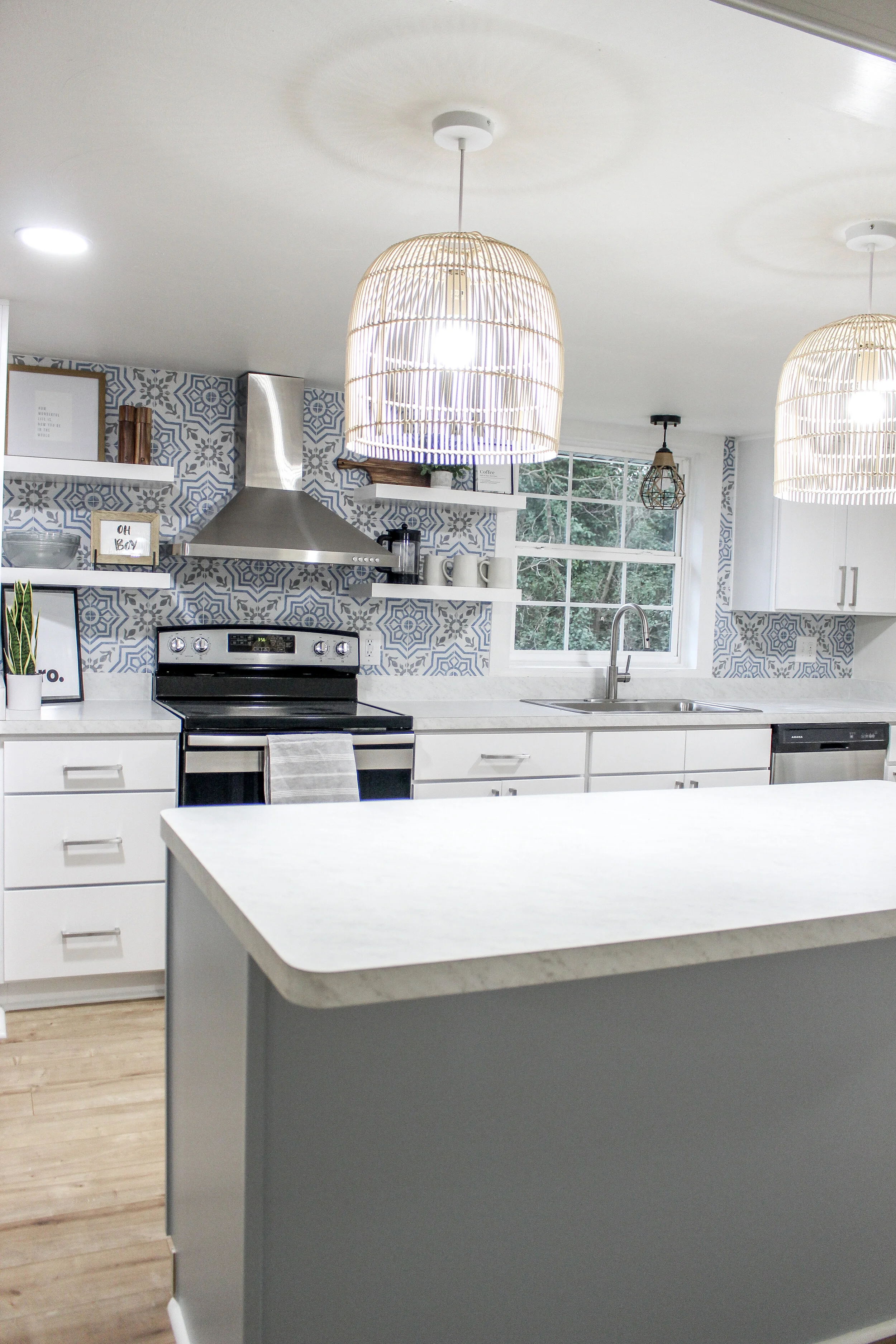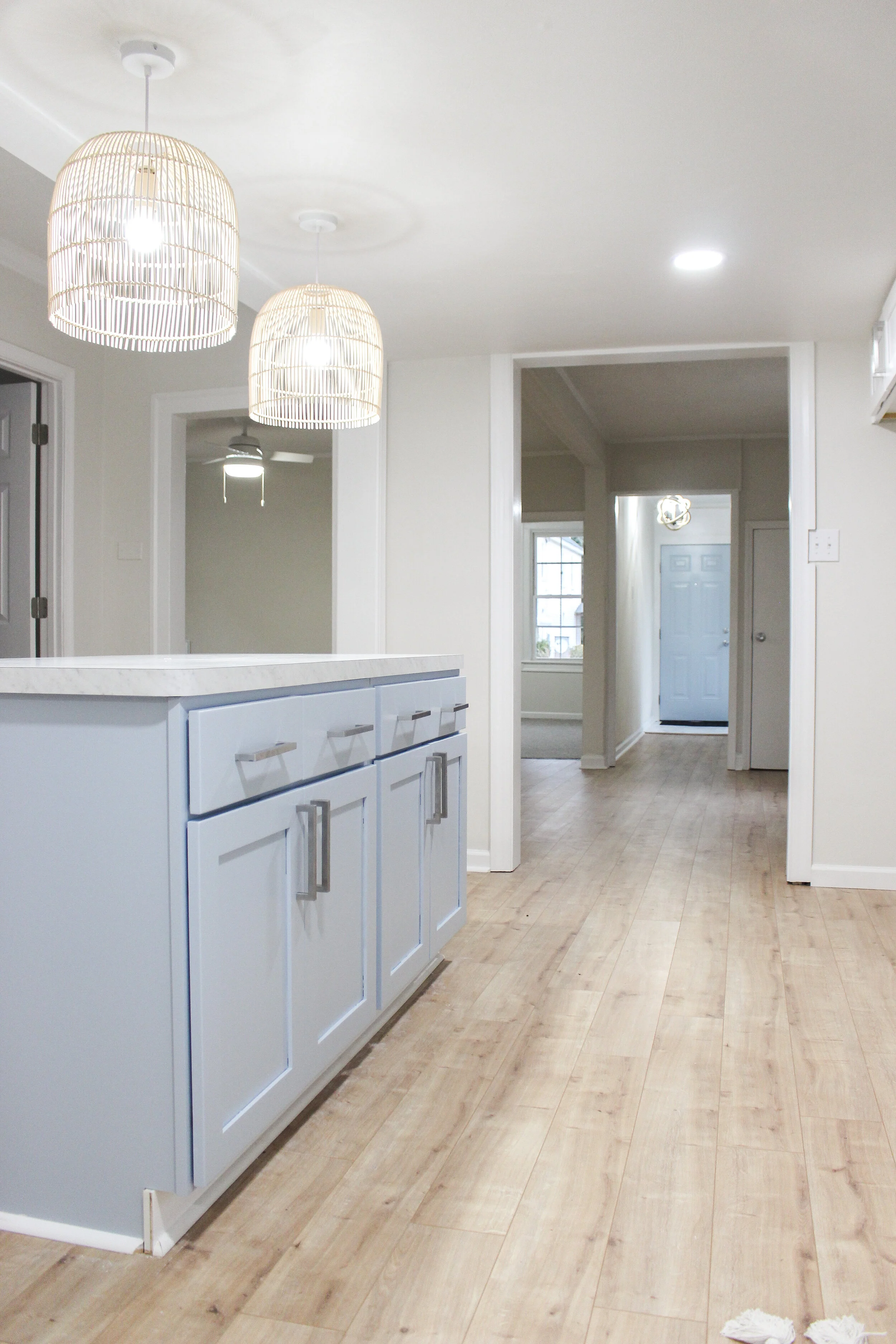 This baby blue island, more specifically Sleepy Hollow by Sherwin Williams, welcomes you into this space and is paired so perfectly with the “bird cage” pendant lights, to which my boy crew of workers so lovingly refers. They are unavailable on Amazon but here is other inspiration for rattan pendant lighting from Ikea.