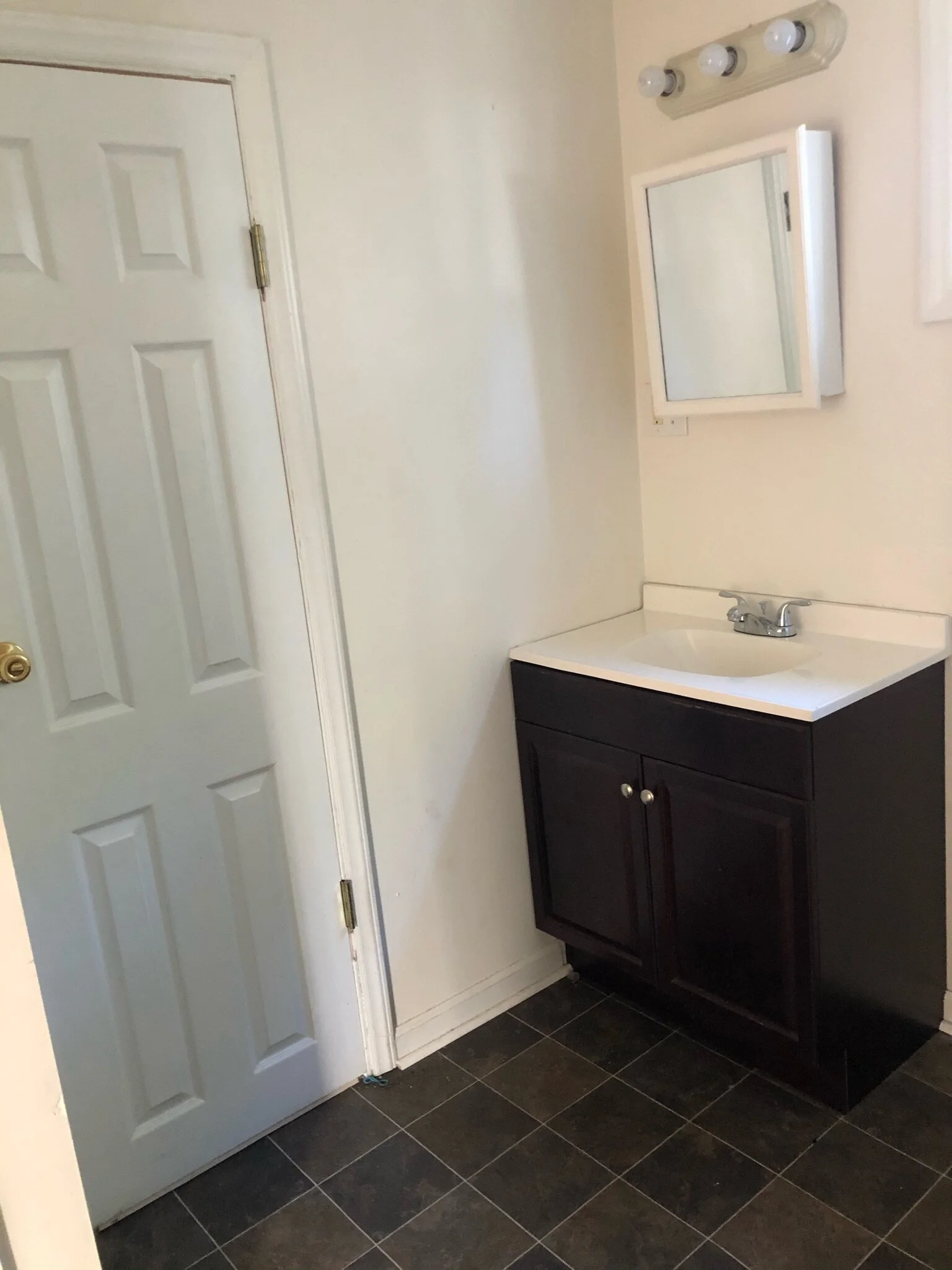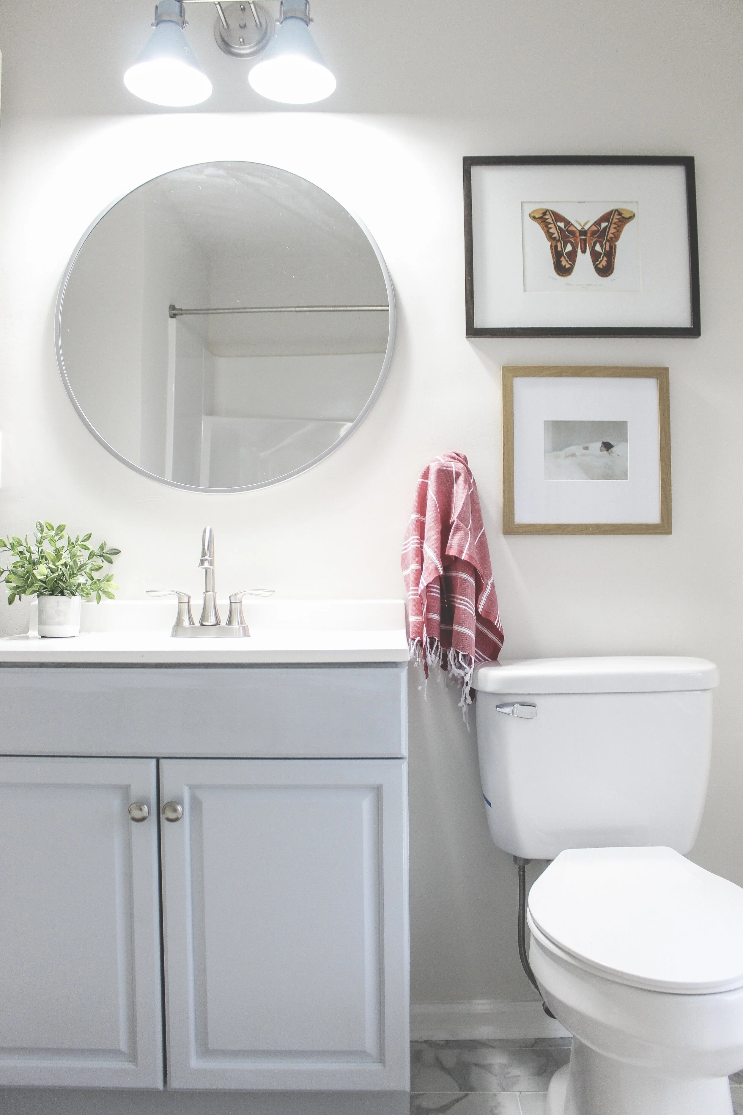 Here’s another Pro Tip for my budget loving, house flipping friends: refinishing a bathroom vanity can save you anywhere from $250-$1000 depending on your project and space. We even used the original white vanity tops which were white and in great condition. New hardware, faucets, mirrors, and light’s can transform a bathroom on a very low budget.