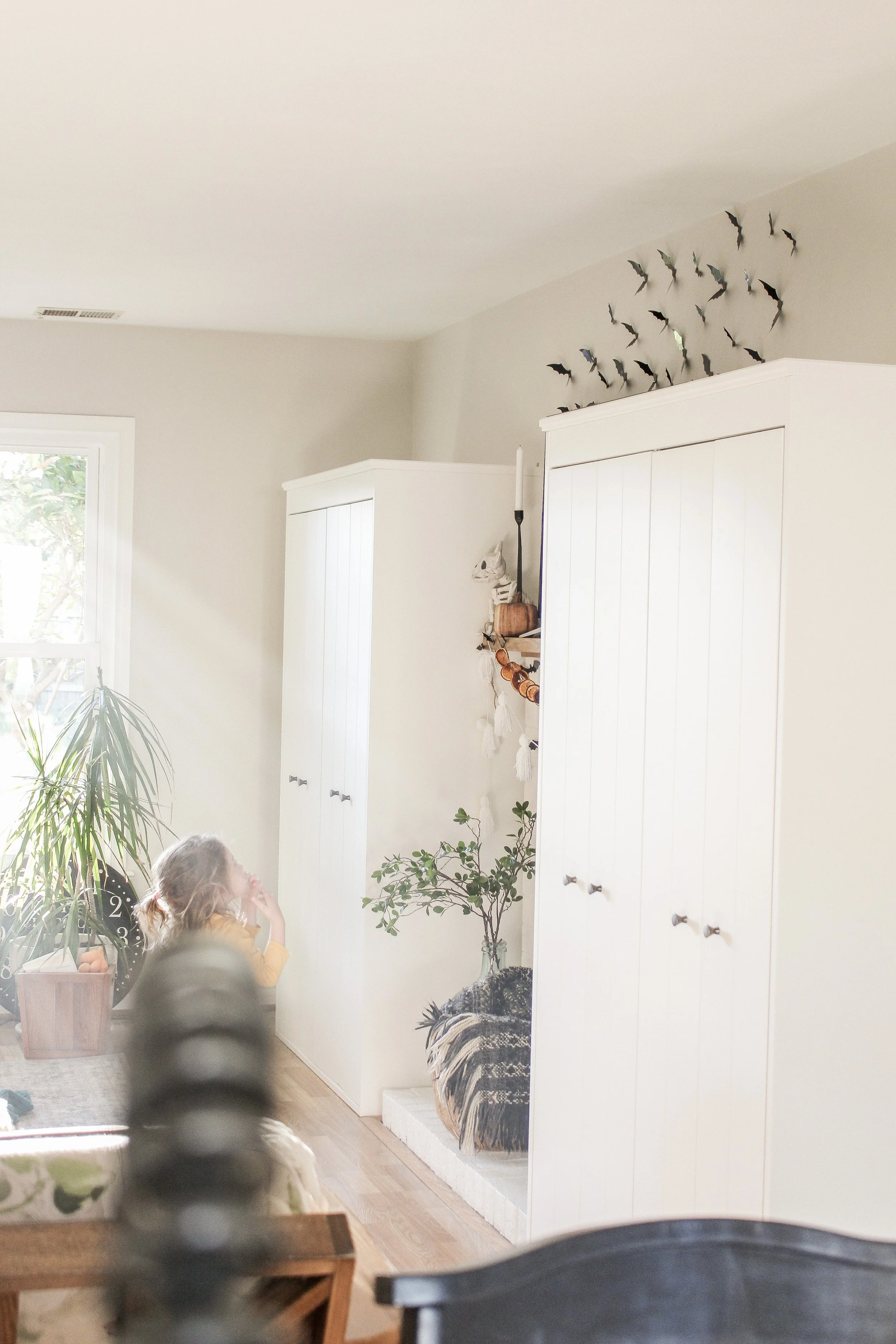 One of the first projects I personally tackled was the fireplace. It needed some lovin’ so I painted it ultra white to contrast the light greige on the walls and added Ikea Idanas Wardrobes to the sides for a non-built-in renter friendly storage option.