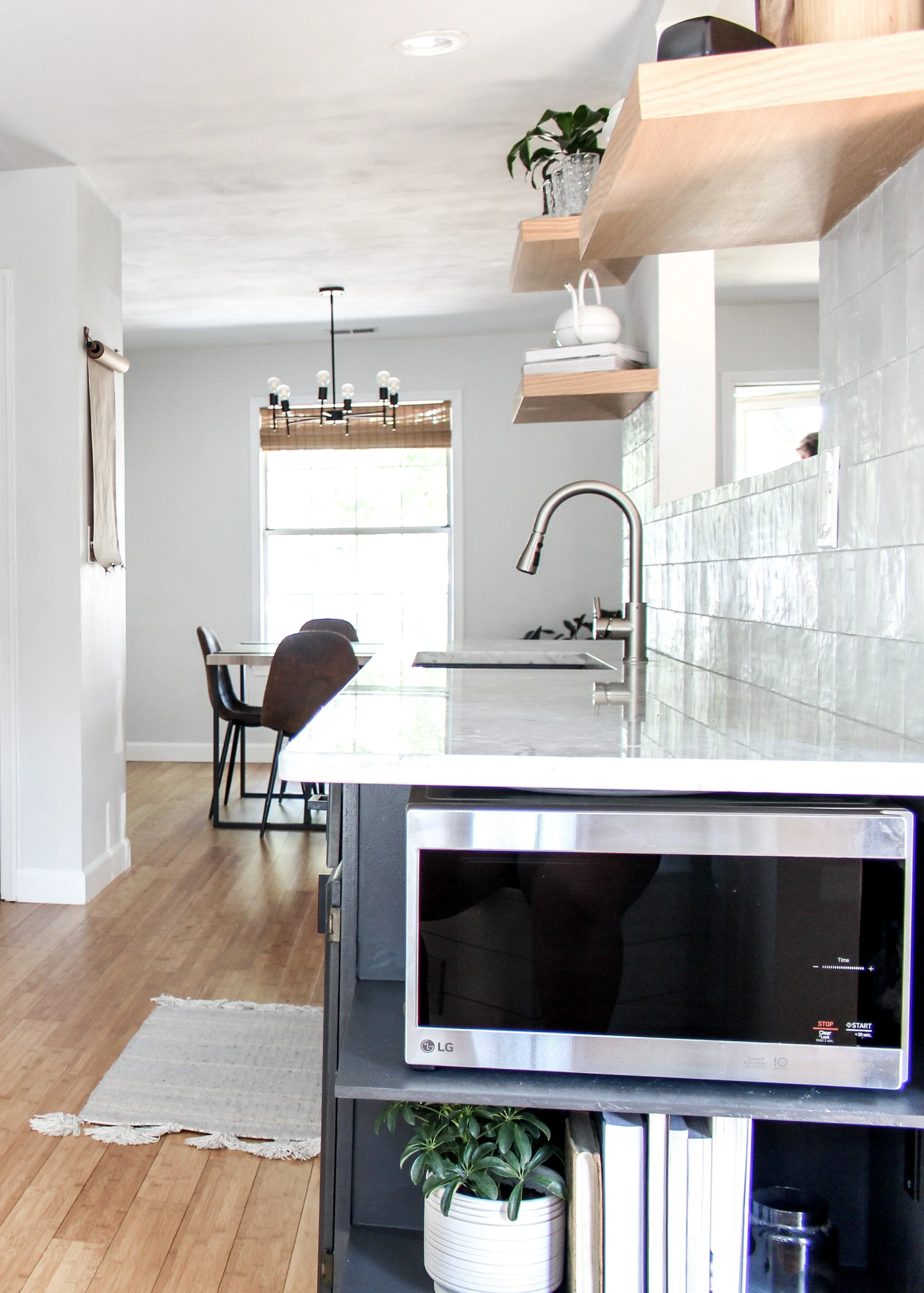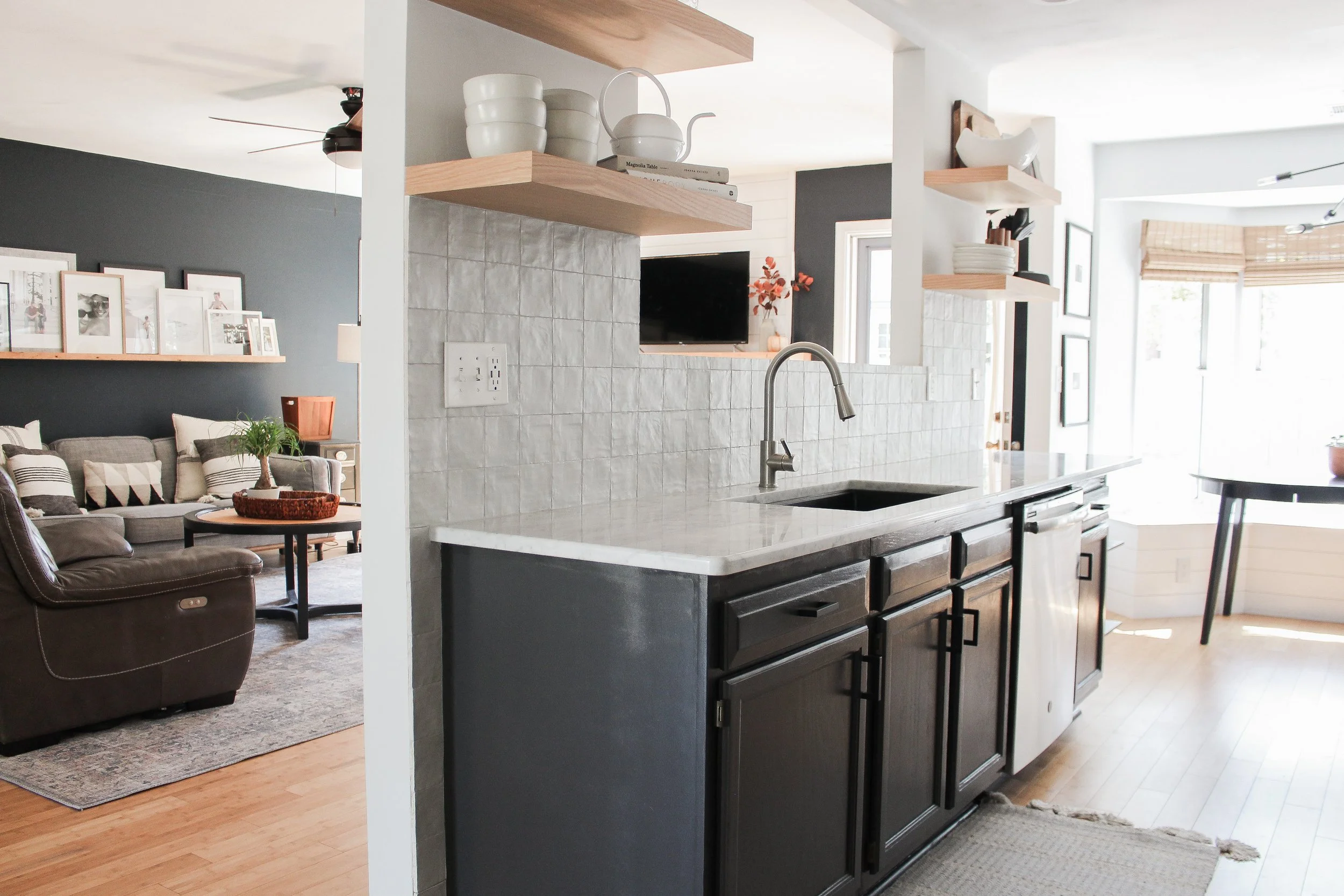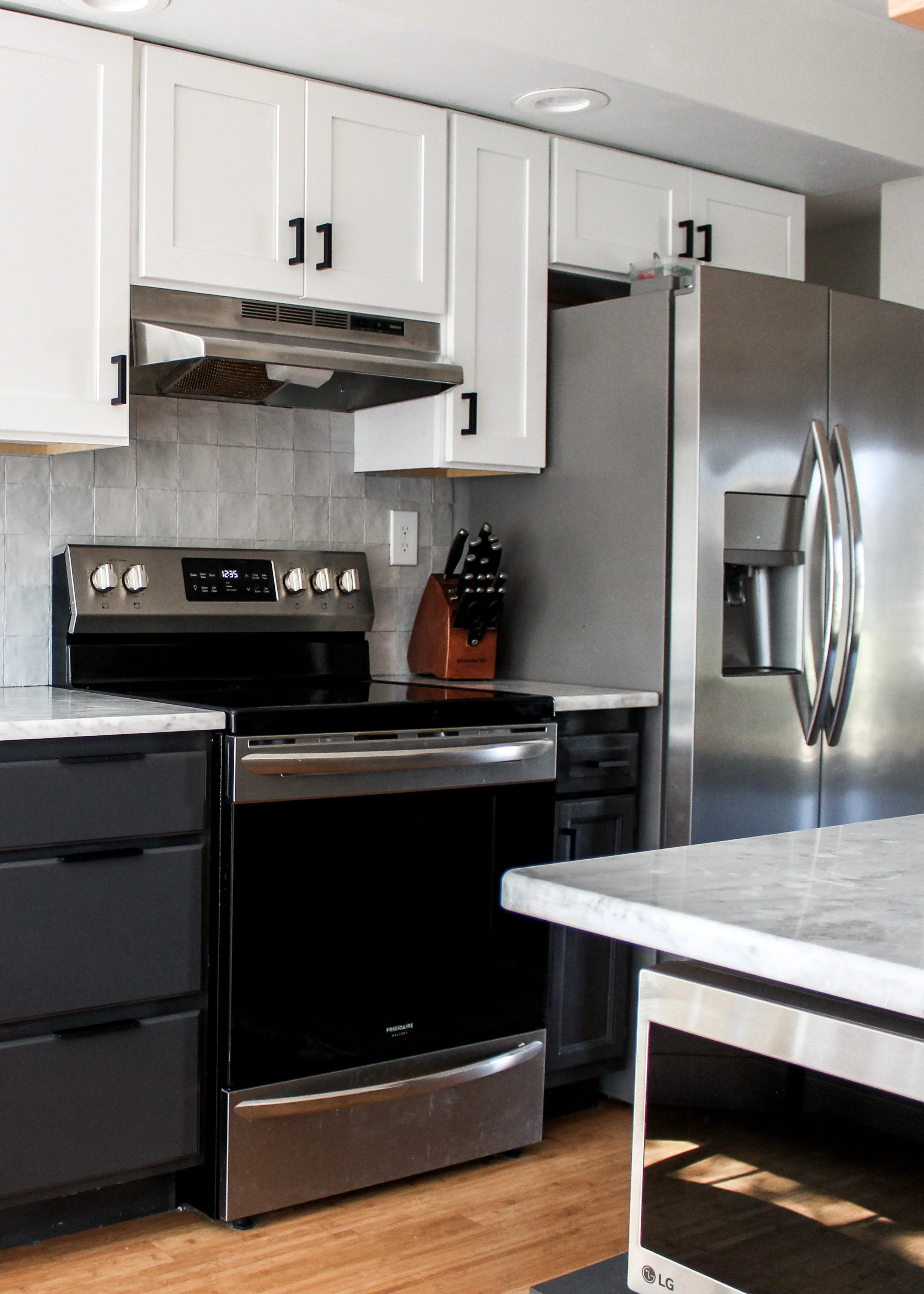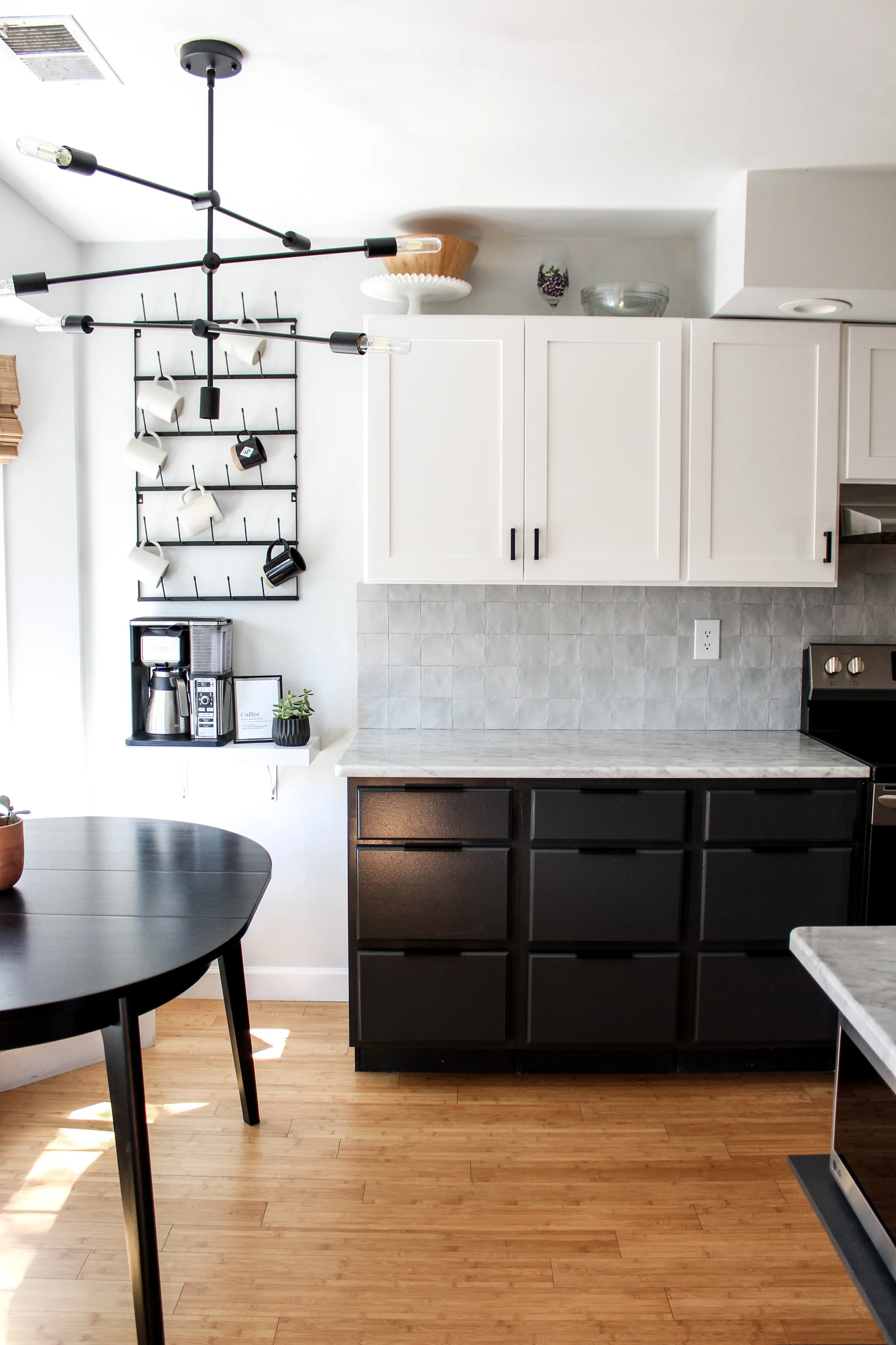 The kitchen was a labor of love that took all of the two years of living in the house to finish. The upper cabinets were new and the bottom cabinets were painted Carbonized by Behr paint. At the time, replacing half of the cabinets was all we could afford. We loved the two tone look though and we were so pleased with the final product. The countertops are marble and complimented the pretty square tile backsplash from Home Depot that I swooned over the whole time living there.