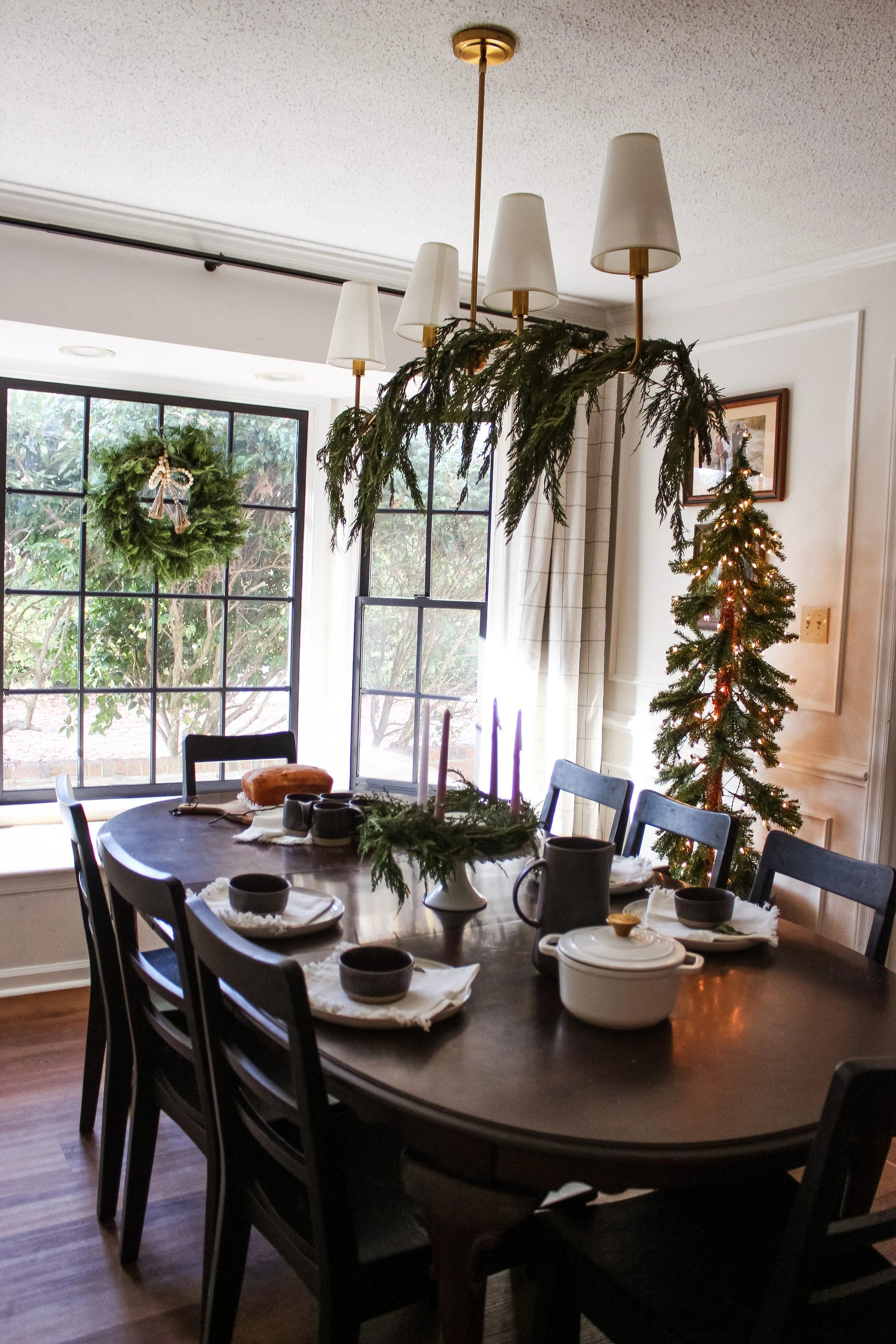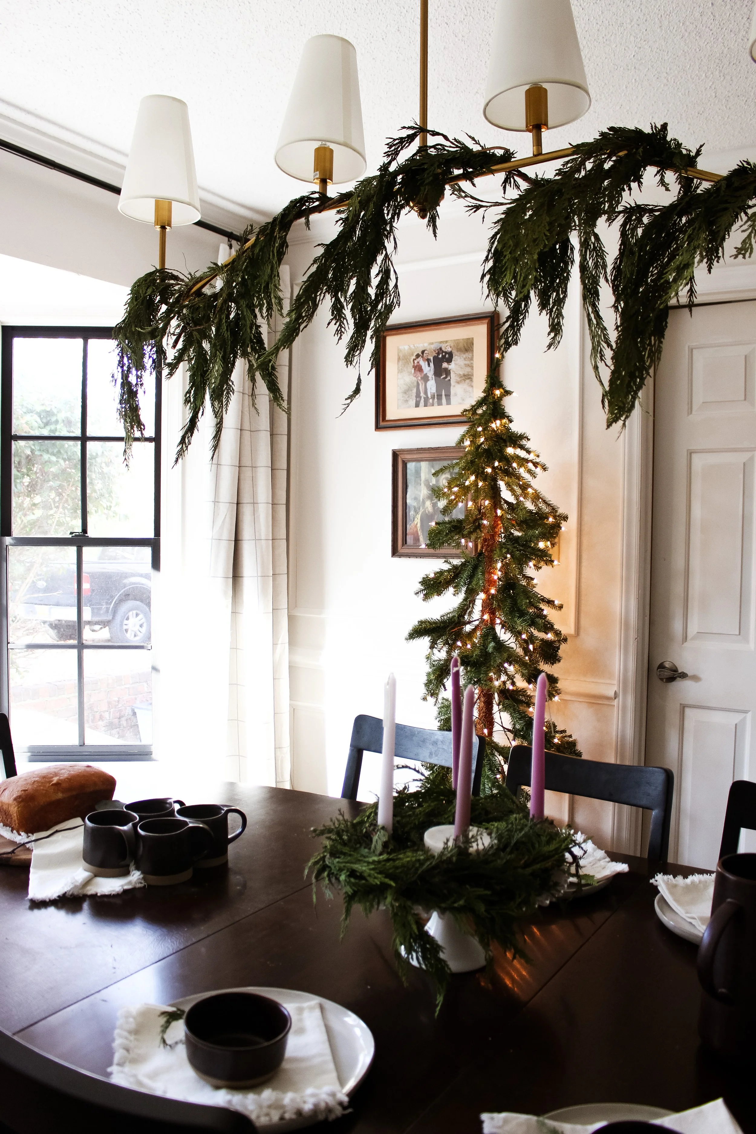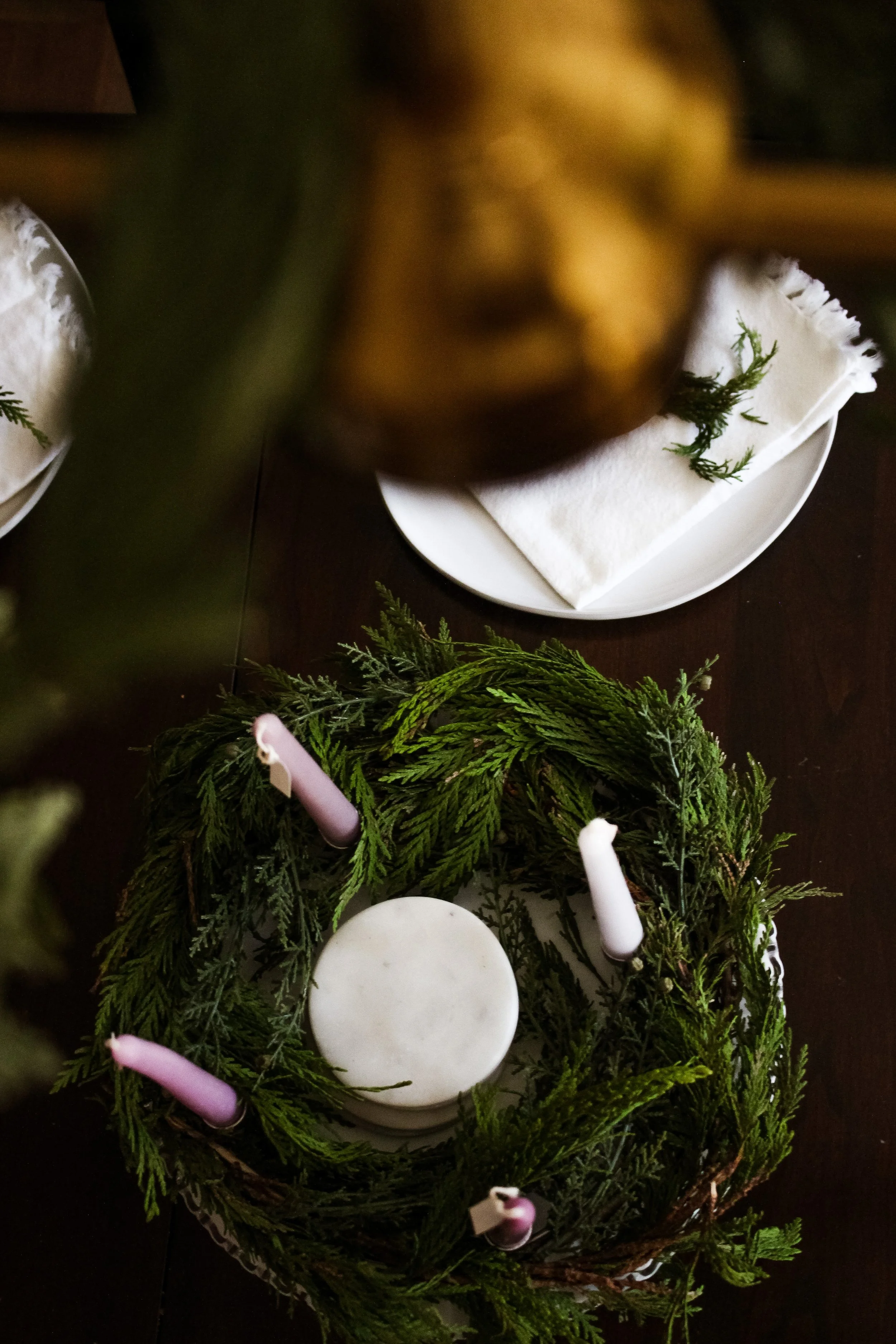 I placed our advent wreath on my grandmothers antique cake stand centered on the table. I love my grandmother so much and she is passing away at this point in time. This is a head-nod to her and helps me remember all of the Christmas memories I had at her house growing up.