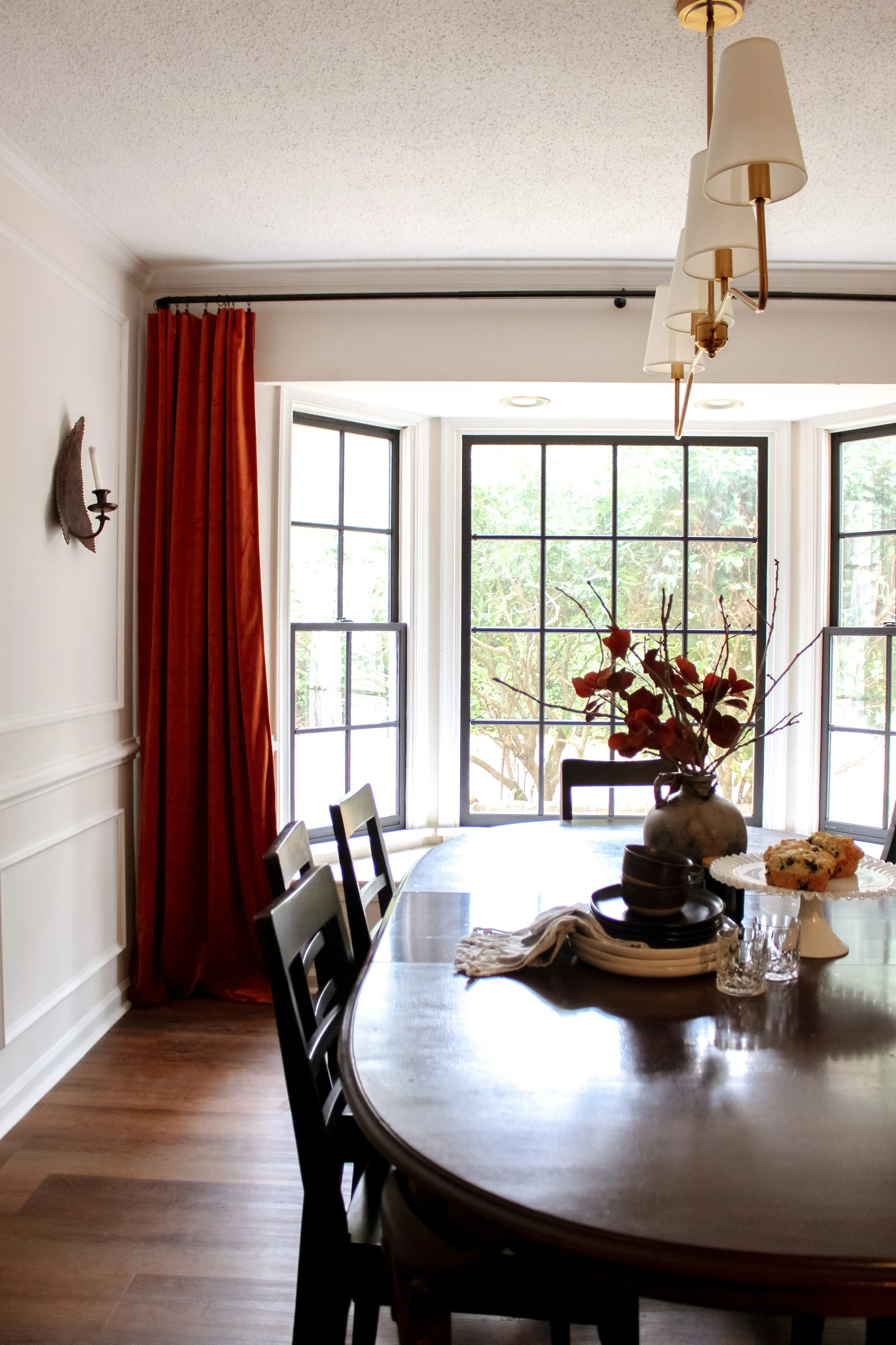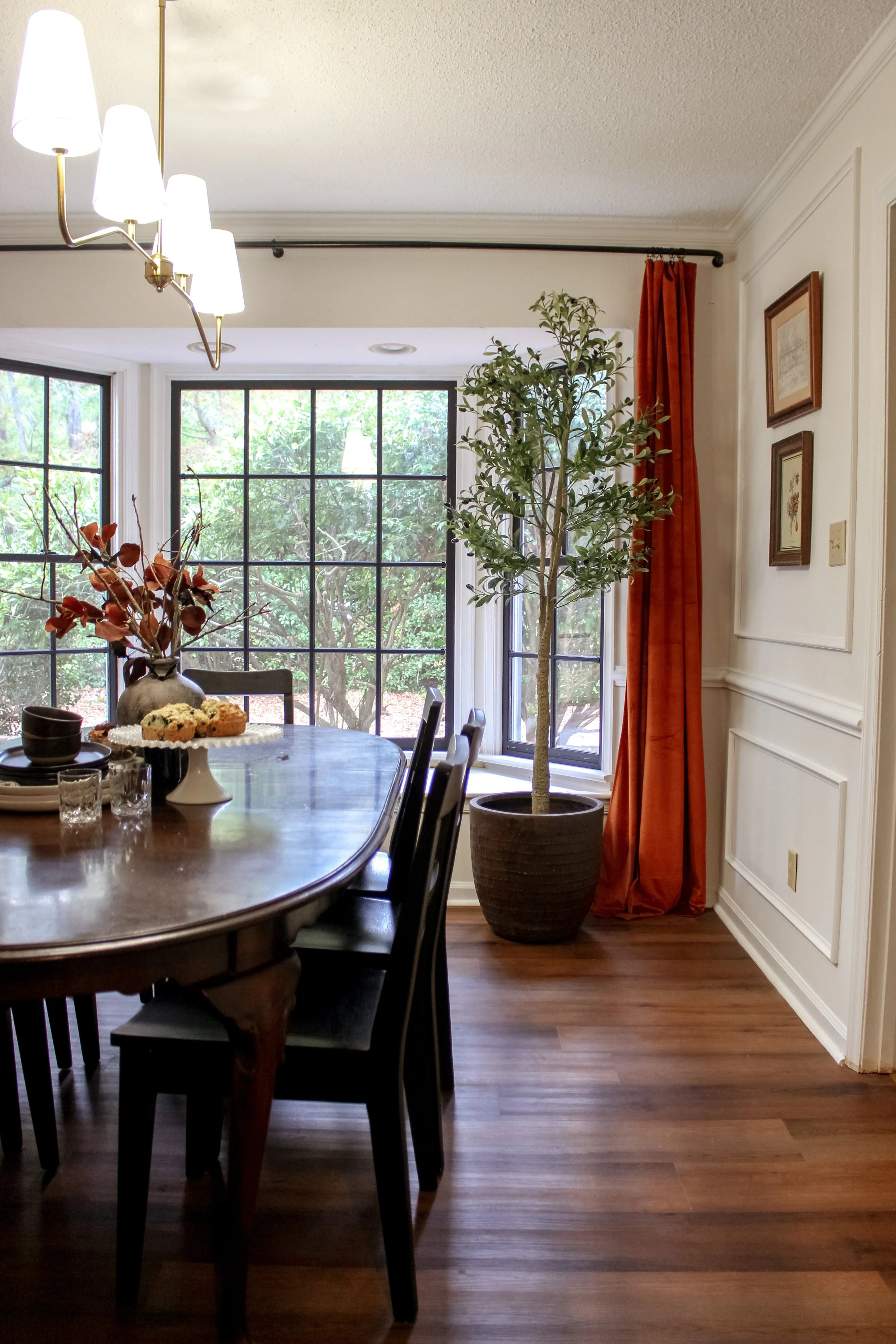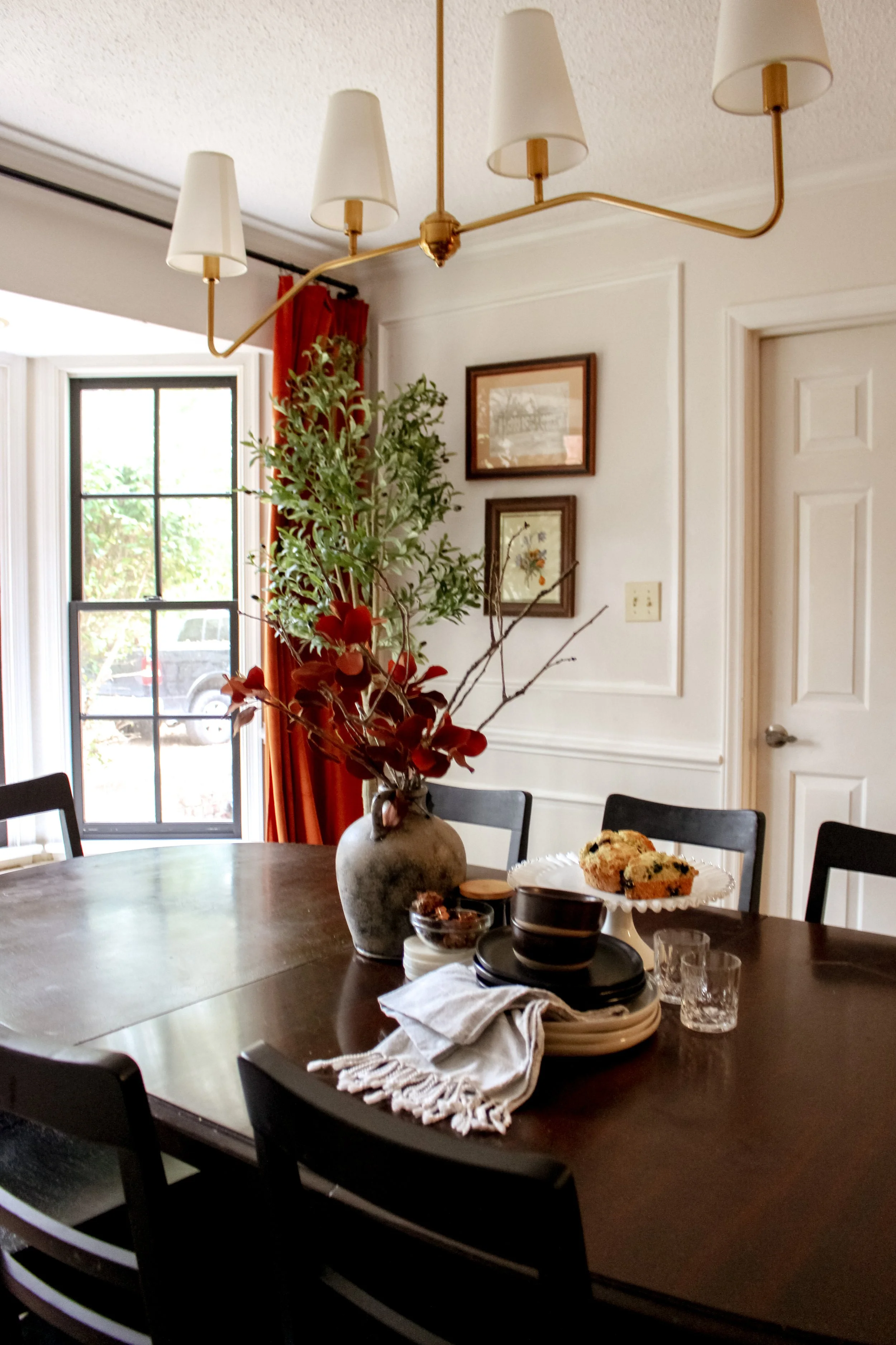 The fall dining room was as magical as it looks in photos. I’d like to argue even more magical. The rust curtains, the faux olive tree, and the fall stems all worked together to create this trifecta of fall elegance.