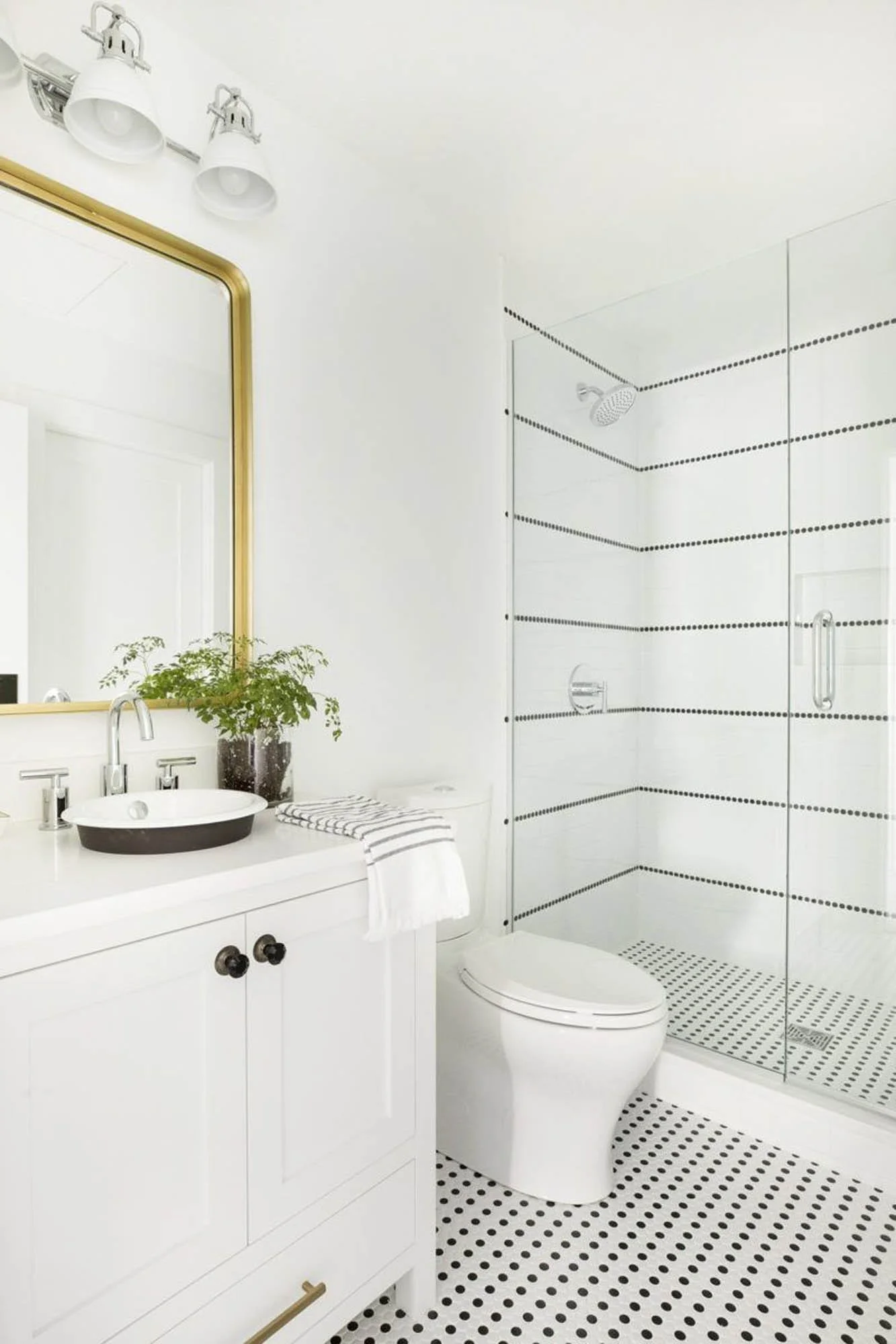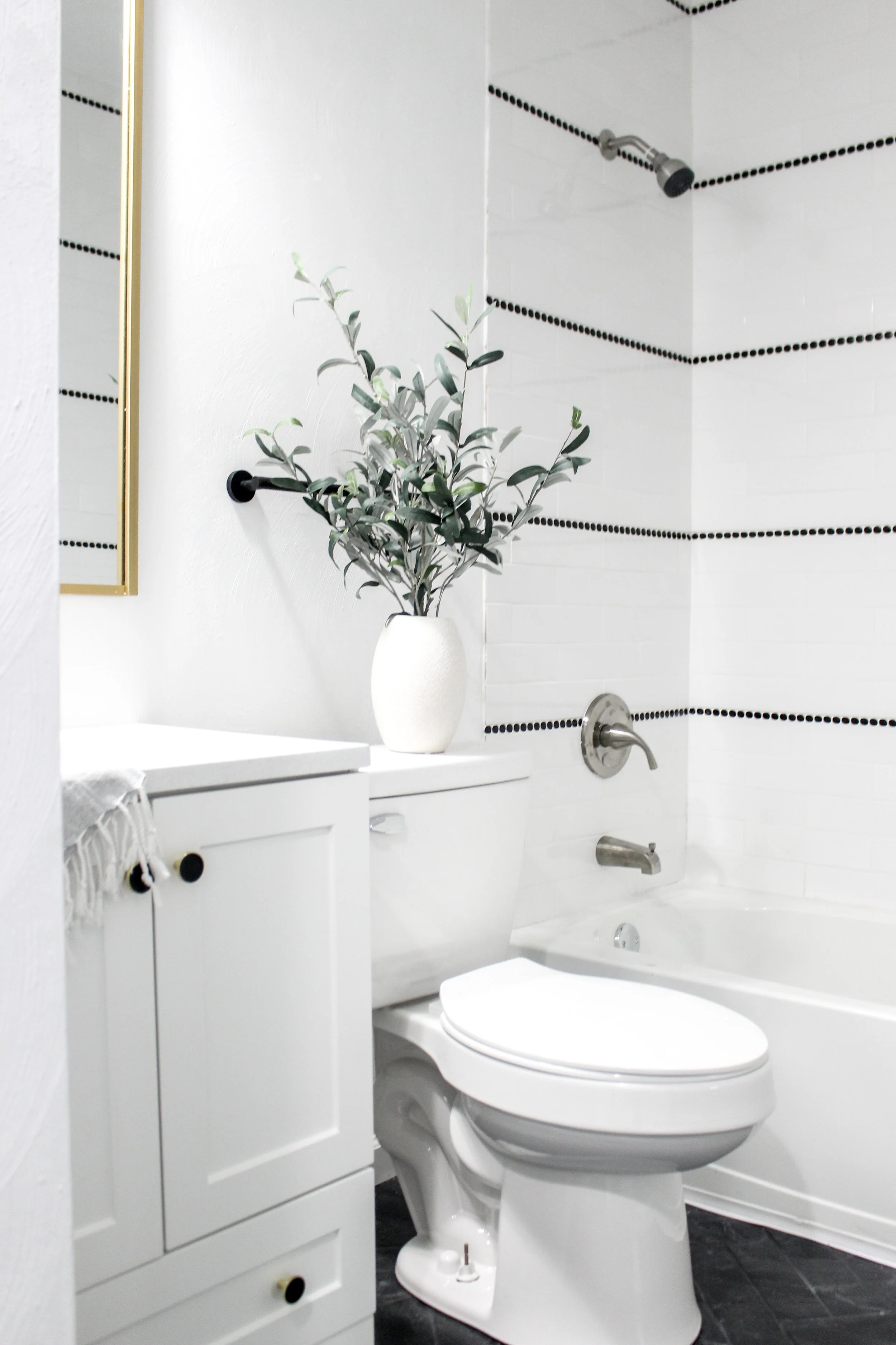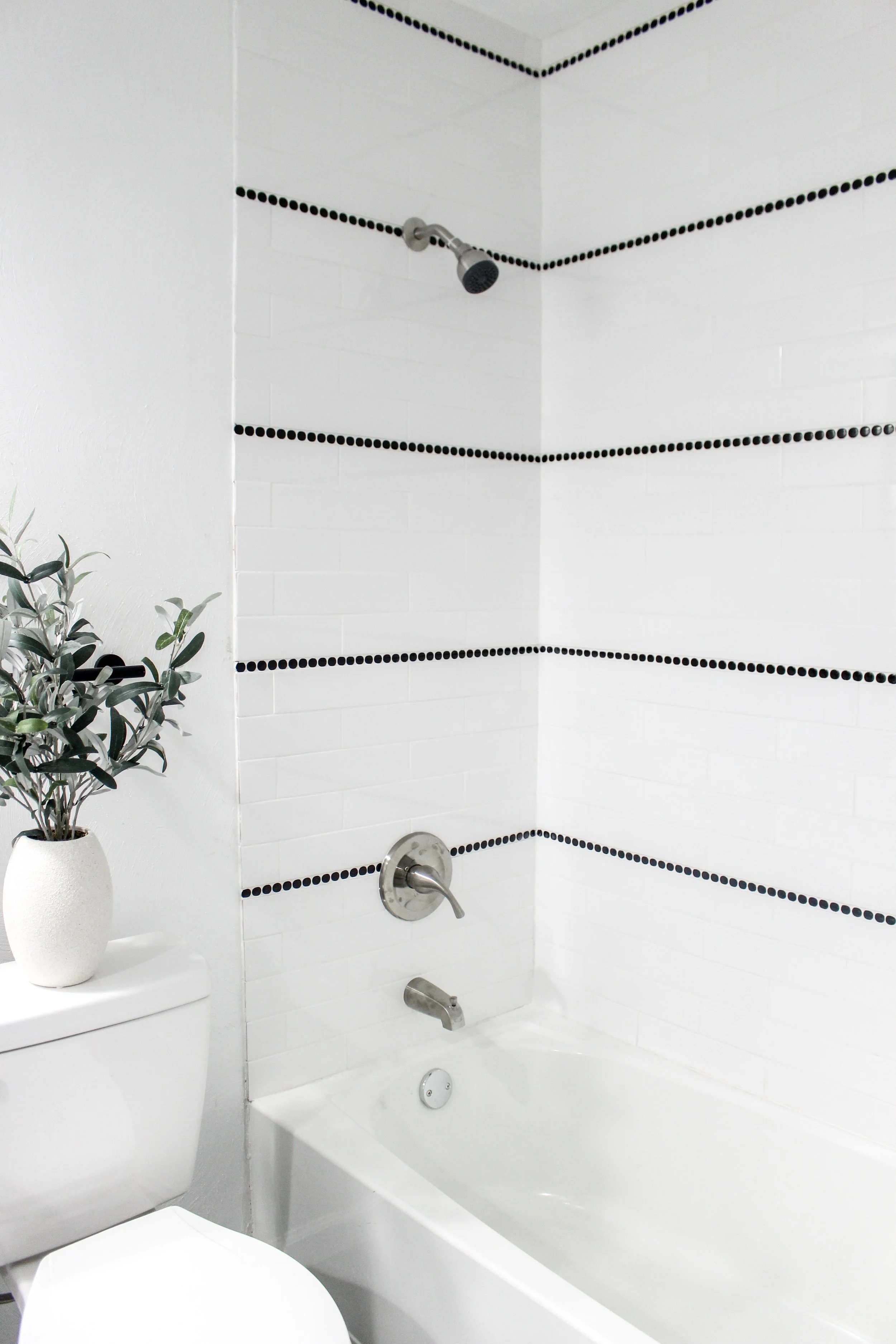 And speaking of black and white… this striped bathroom though! It is for sure the cutest pattern in a shower we’ve done yet. I’m absolutely obsessed with how it came out.