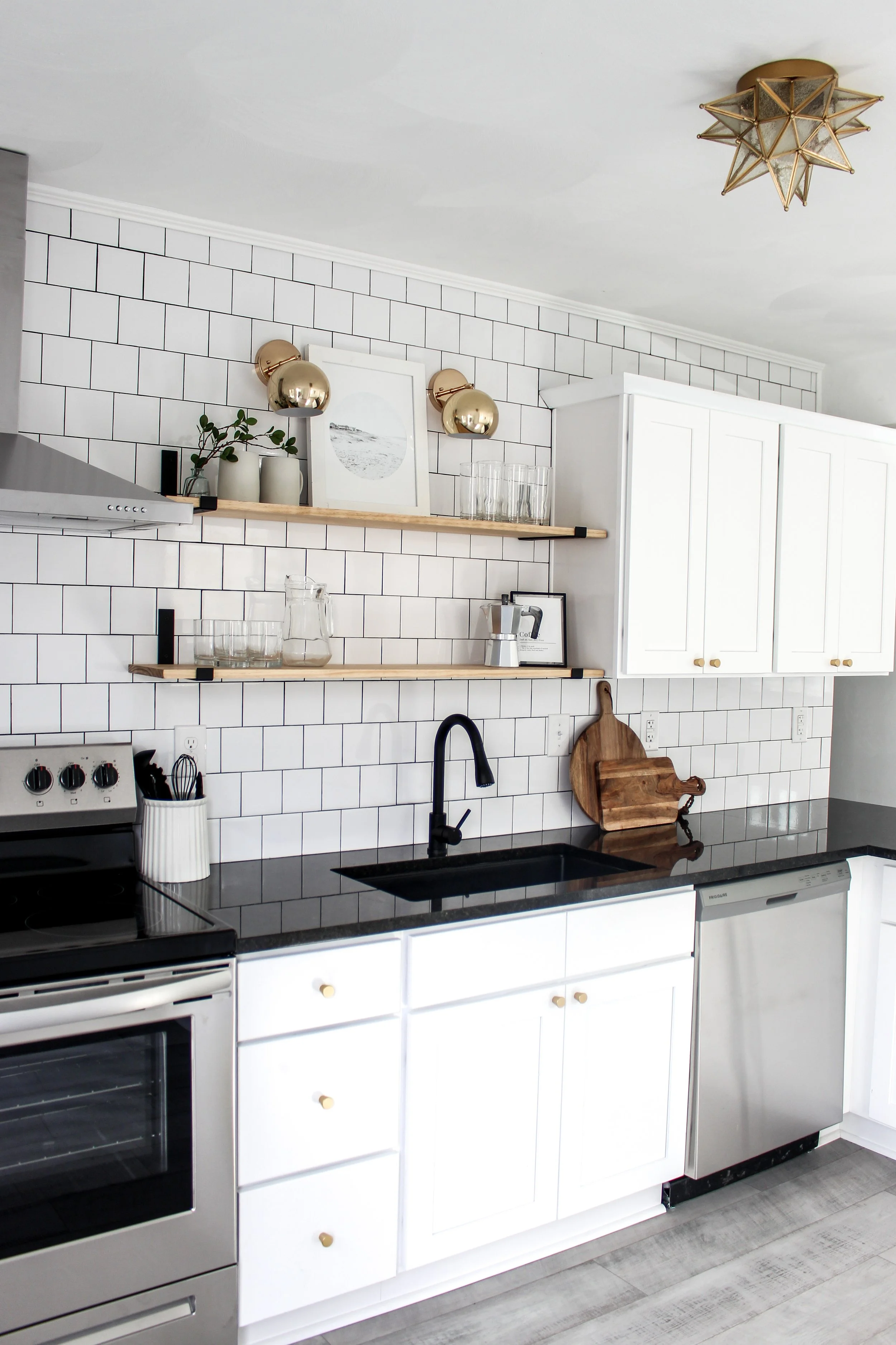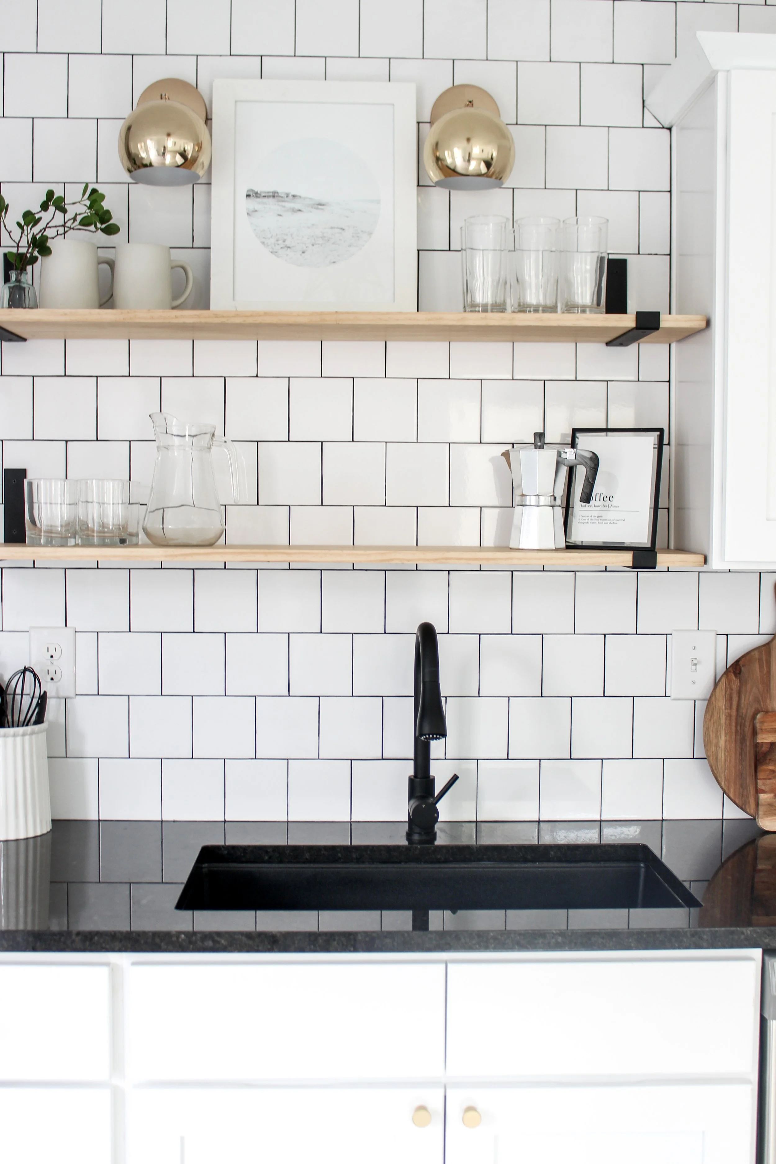 We finished these open shelves with common board that were rubbed with tung oil for a natural, warm finish. I love how open shelves give kitchens more depth, character, and an opportunity to display kitchen essentials, art, or photography. This sink and faucet from Amazon finished off the classy black and white look throughout the home.