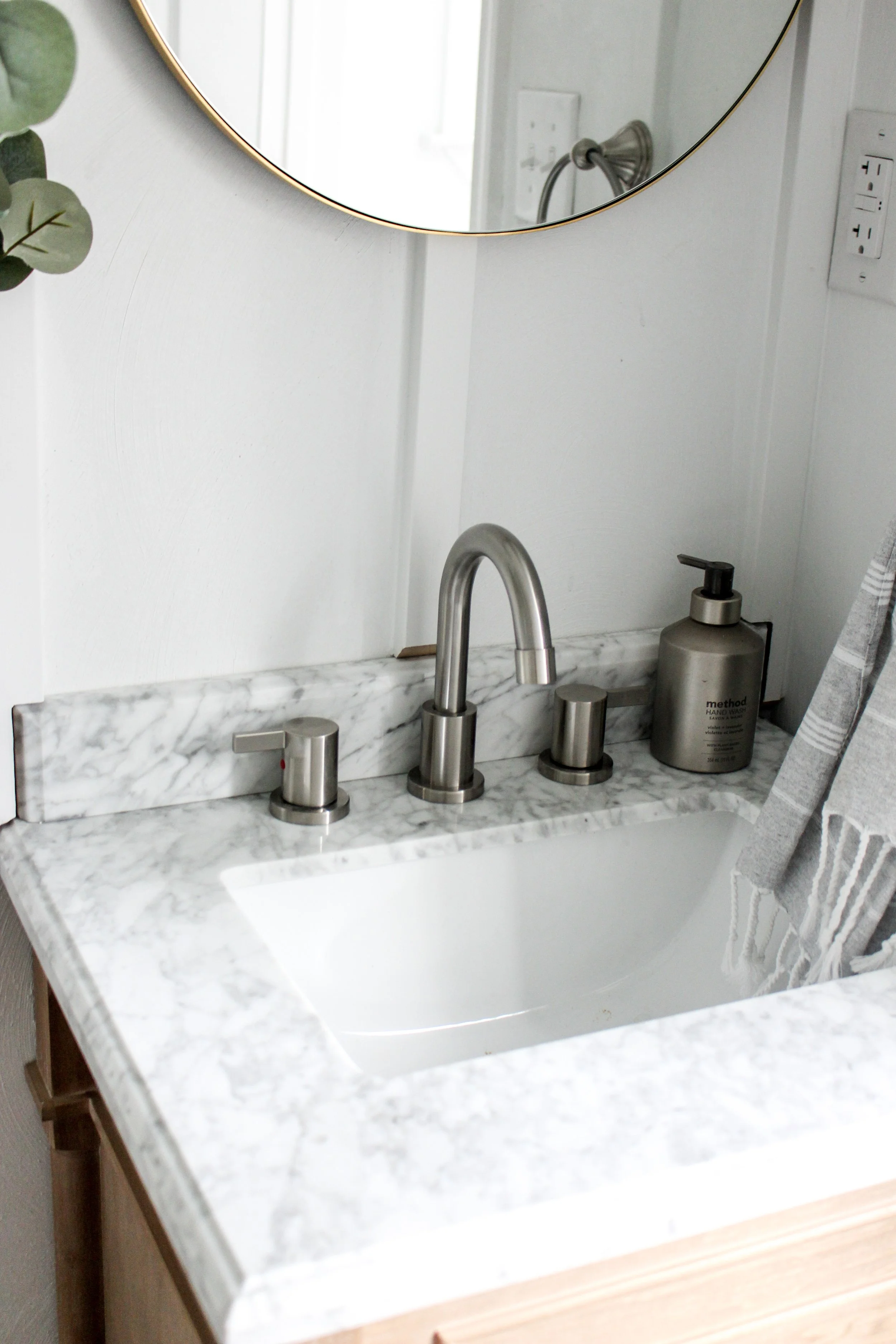 The last space in this house was this cute little half bath close to the kitchen. I knew I wanted a wood vanity somewhere in the home (I usually want wood vanities somewhere in all my homes) so on Black Friday, I found this amazing deal on this vanity at Home Depot. It wasn’t the cheapest vanity we have put in our homes, but it was only 24 inches and didn’t break the bank entirely. Right now it’s over $800 but we paid $520 back in November! Another argument for the splurge was that we were keeping this house as a rental and it’s always nice to have a little nicer quality of some things in a house we keep.