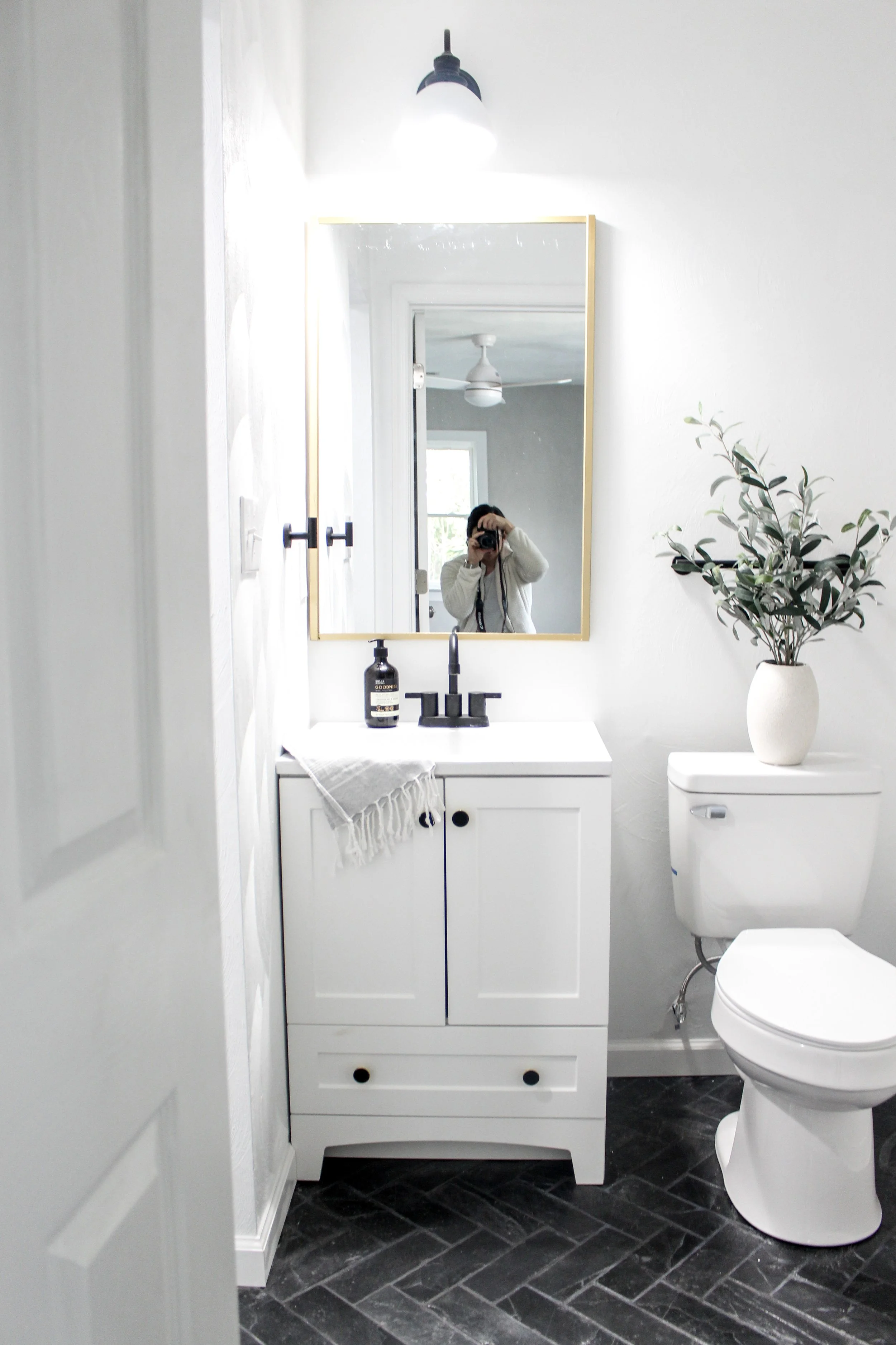 Sean asked me to pick a texture for the walls since it seemed like a doable space to add some flare so we went with floor-to-ceiling board and batten. I loved the simple, yet classic look that elevated the space so much. I’m also obsessed with these black herringbone sheet tile we installed on the floor as well. This room is tiny and choosing a “middle of the road” tile that is a little pricer than we usually go was doable here in this small half bathroom.
